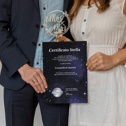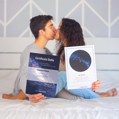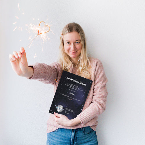 Riceverai un certificato stellare personalizzato per la tua stella nominata. Offriamo una vasta selezione di diversi disegni, così come la possibilità di aggiungere una dedica personale.