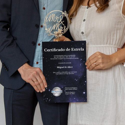Você receberá um certificado de estrela personalizado para sua estrela nomeada. Oferecemos uma grande seleção de diferentes designs, bem como a possibilidade de adicionar uma dedicatória pessoal.